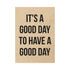 De kaart āIt's a good day to have a good dayā is een bruineĀ ansichtkaart van eco vriendelijk kraft karton met zwarte quote. Aan de achterkant is ruimte om iets te schrijven en lijntjes voor de adresregels.